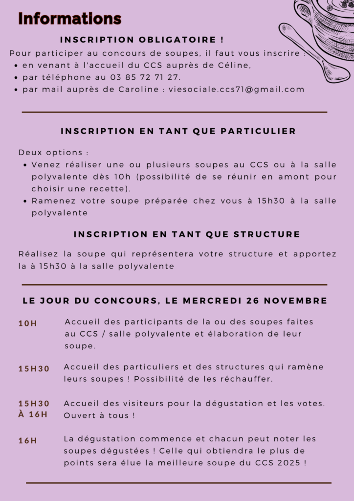 « Tous les Évènements Concours de Soupes 26 novembre : 15 h 30 min - 18 h 00 min « Organisation Vacances ANCV été 2026 Ajouter au calendrier Google Agenda iCalendar Outlook 365 Outlook Live Détails Date : 26 novembre Heure : 15 h 30 min - 18 h 00 min Catégorie d’Évènement: Familles Lieu Salle Polyvalente Rue des Écoles Cuiseaux, 71480 France + Google Map Organisateur CCS Cuiseaux Téléphone 03 85 72 71 27 E-mail ccs71@orange.fr