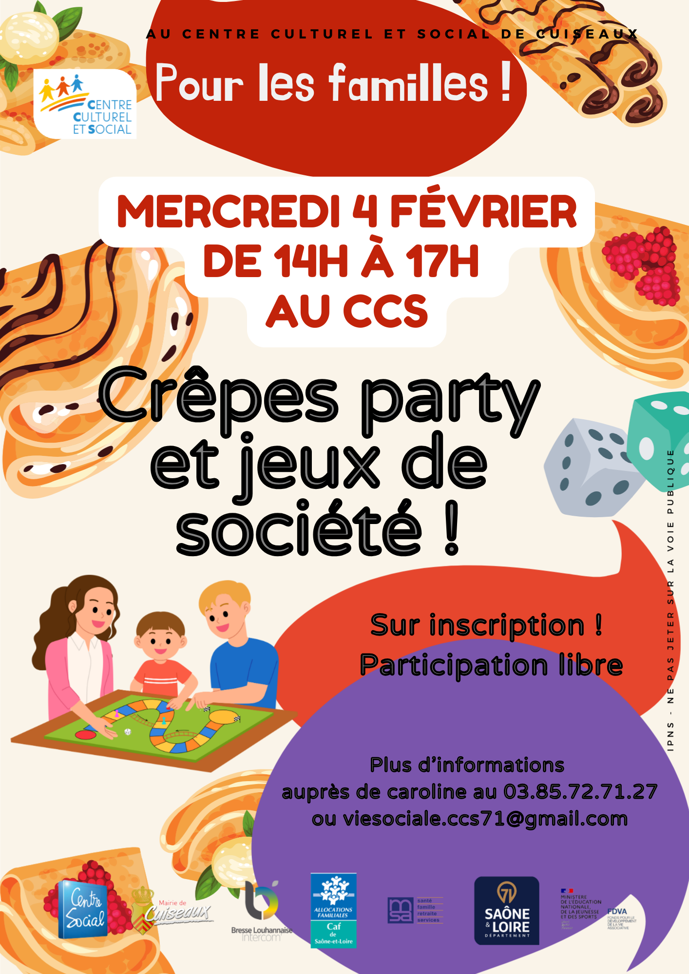 « Tous les Évènements Crêpes party & Jeux de Société 4 février : 14 h 00 min - 17 h 00 min « CINEMA : Avatar – De Feu et de Cendres Accueil de Loisirs Hiver 2026 » Ajouter au calendrier Google Agenda iCalendar Outlook 365 Outlook Live Détails Date : 4 février Heure : 14 h 00 min - 17 h 00 min Catégorie d’Évènement: Pause Récré-Active Organisateur CCS Cuiseaux Téléphone 03 85 72 71 27 E-mail ccs71@orange.fr Lieu Château des Princes d’Orange 1 rue des Lombards Cuiseaux, 71480 France + Google Map Téléphone 03 85 72 71 27